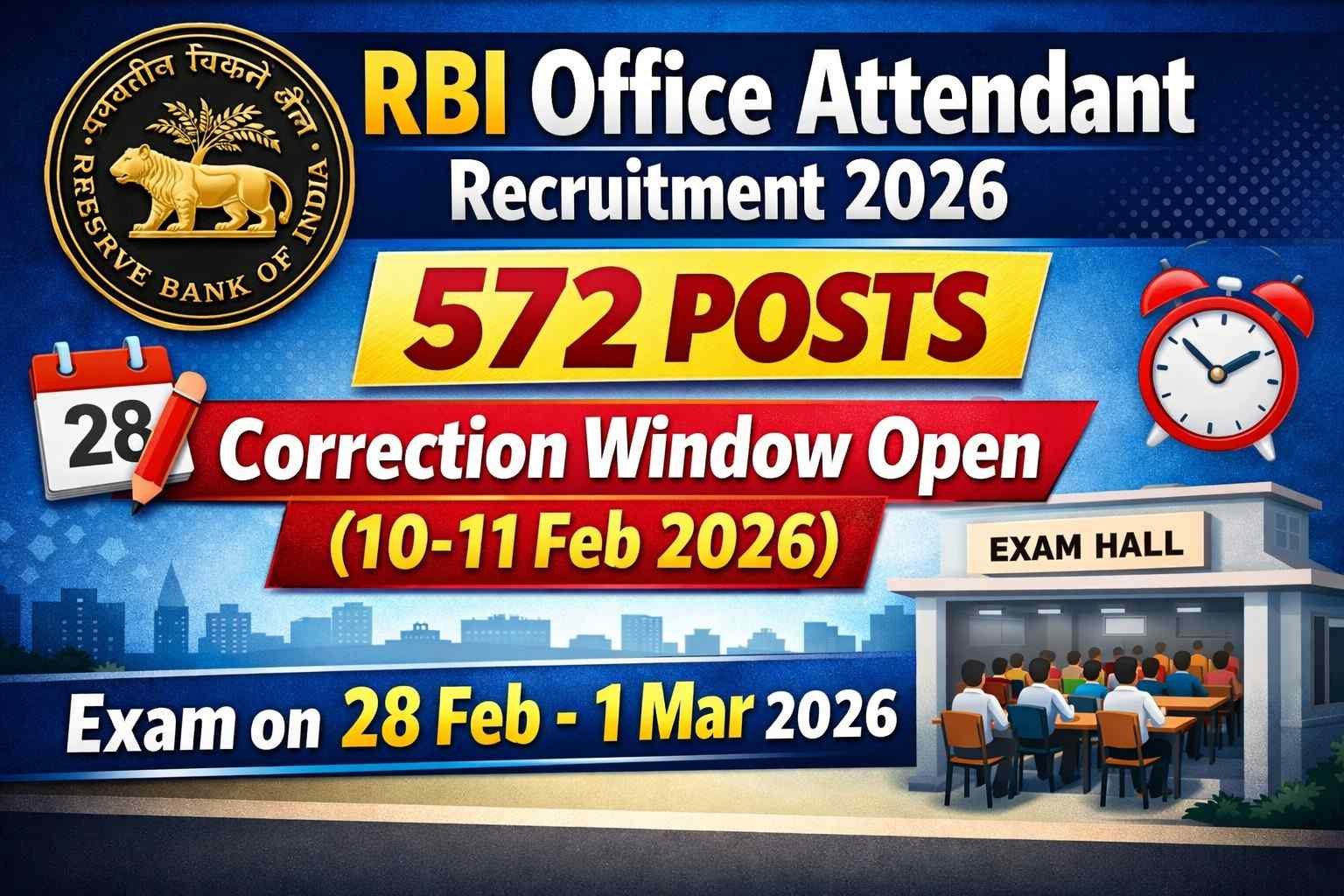 RBI Office Attendant Recruitment 2026 – 572 Posts | Correction Window Open (10-11 Feb 2026) | Exam on 28 Feb – 1 Mar 2026